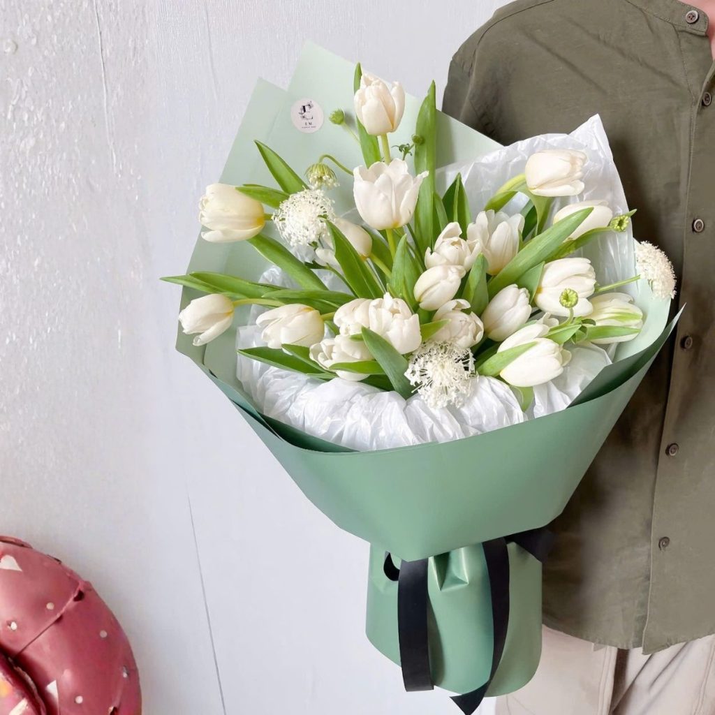 Ngay khi mở giấy, Tadida tạo nên một khoảng trời dịu mát. Sắc trắng của tulip hòa cùng thúy châu bồng mềm, nổi bật trên lớp giấy xanh mint mượt mà và dải nơ đen tinh gọn. Không phô trương, bó hoa chậm rãi kể một câu chuyện về sự yên tĩnh và thanh lịch, như một hơi thở trong trẻo giữa ngày bận rộn.