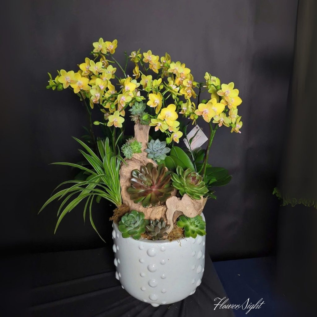 Có chậu lan vàng trong văn phòng hay tặng người thân sẽ làm không gian trở nên sinh động, tươi mới và tràn đầy năng lượng tích cực. Thiết kế hài hòa, kết hợp các nhánh hoa lan và sen đá giúp không gian thêm phần trang nhã. Món quà này vừa có giá trị trang trí, vừa truyền tải thông điệp may mắn, thịnh vượng và hạnh phúc đến người nhận.
