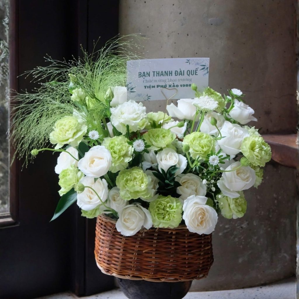 giỏ hoa khai trương này bao gồm hoa hồng tươi thắm, biểu tượng của tình yêu và thành công, hoa cát tường duyên dáng với ý nghĩa về sự may mắn, cùng thúy châu nhẹ nhàng và cỏ suối tươi mới, mang đến cảm giác thoải mái, tươi vui cho không gian làm việc. Đặc biệt, tất cả được kết hợp trong giỏ mây trang nhã, tạo nên một tổng thể hoàn hảo, vừa thanh lịch, vừa sang trọng.