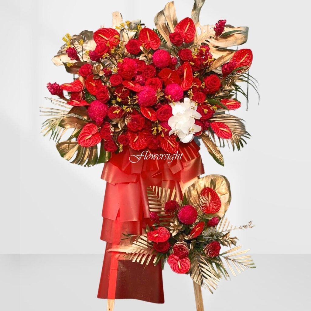 Kệ hoa khai trương “Thành công vững mạnh” được thiết kế hai tầng, sắc đỏ rực rỡ, biểu tượng của sự vạn lộc phát tài. Kệ hoa chúc mừng ” Thành công vững mạnh” phù hợp để tặng những dịp như khai trương, khánh thành, động thổ, chúc mừng khởi công, triển lãm, khai trương công ty, cửa hàng cùng những lời chúc tốt đẹp và may mắn.