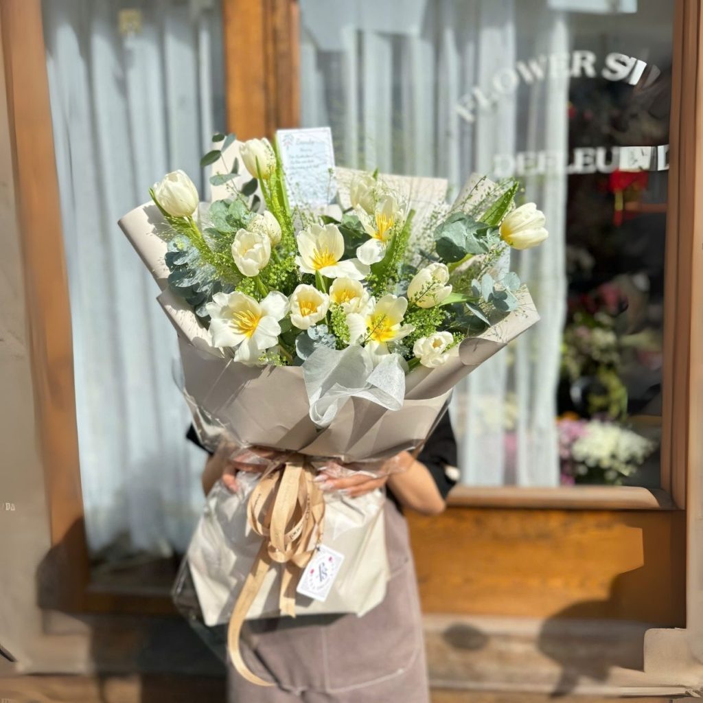 Nhìn “Thảo nguyên xanh”, tôi thấy một buổi sớm trong veo. Màu trắng ngà của tulip mở khẽ như tiếng thì thầm, ở giữa hé vàng nhẹ tựa nắng đầu ngày. Bao quanh là những dải xanh mướt làm dịu mắt, đủ để người nhận chỉ cần chạm mắt là thấy bình yên. Tôi chọn tên “Thảo nguyên xanh” vì cảm giác thênh thang mà bó hoa mang lại, không ồn ào, không phô trương, chỉ là vẻ đẹp thanh sạch khiến ai cũng muốn giữ gần thêm một chút.