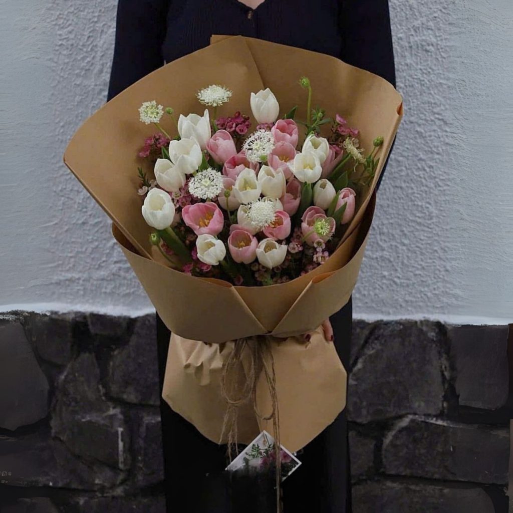 Ngay từ cái nhìn đầu tiên, “That girl” khiến tôi liên tưởng đến một cô gái tối giản mà cuốn hút: ăn mặc tinh tế, nói ít nhưng sâu. Bó hoa tulip thuộc tông trắng – hồng được xử lý theo bố cục ôm tròn, xen tầng lớp nhẹ để mỗi bông đều có “không khí thở”. Trên nền giấy kraft màu caramel ấm, sắc tulip hiện lên thanh khiết, dịu mắt và rất hiện đại.