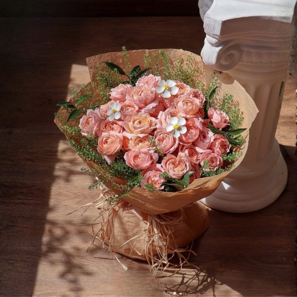 Giấy gói kraft tông nâu nhạt mang đến cảm giác gần gũi, chân thật. Khi ánh sáng chạm vào, lớp giấy tạo nên hiệu ứng mềm, giúp màu hoa trở nên ấm hơn. Phần nơ buộc đơn giản, không cầu kỳ, để toàn bộ sự chú ý vẫn nằm ở hoa – đúng tinh thần của một bó hoa dành cho những cảm xúc nguyên bản.