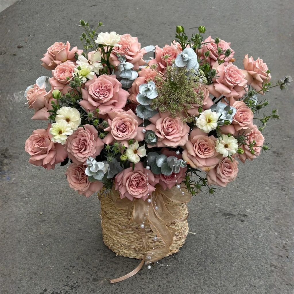 - Giỏ mây và nơ: Không chỉ là một điểm nhấn cho bó hoa, giỏ mây và nơ còn tạo nên sự thanh lịch và sang trọng, mang lại cảm giác ấm áp và gần gũi.