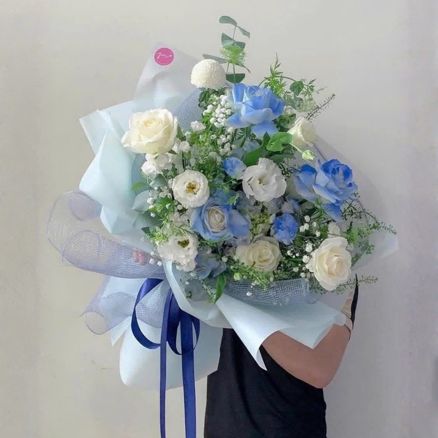 Màu xanh đại diện cho hy vọng, cho tương lai đang mở ra. Màu trắng là những ký ức trong trẻo, là hành trình đã qua. Khi hai gam màu này hòa quyện, bó hoa trở thành một “điểm giao” – nơi quá khứ và tương lai chạm nhau trong một khoảnh khắc rất đẹp.