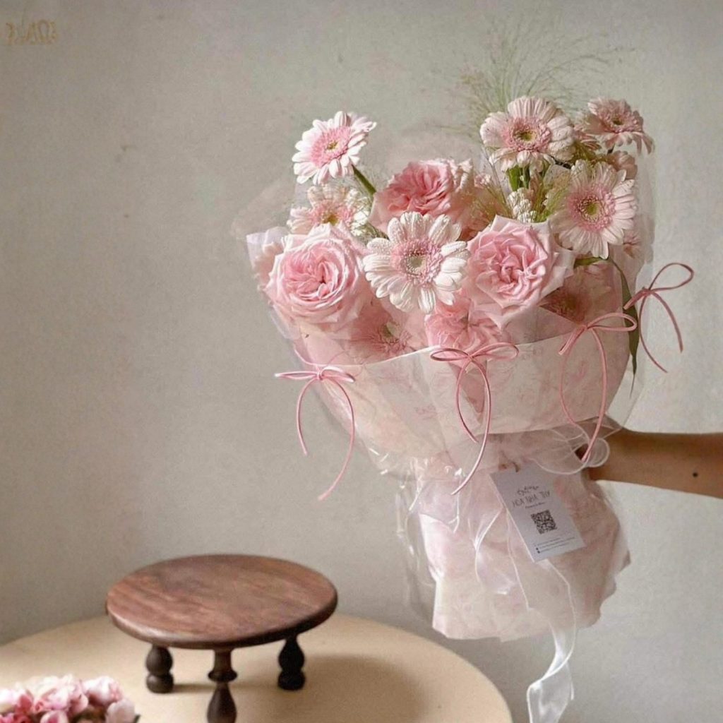 Bó hoa mang tone hồng pastel chủ đạo, không rực rỡ phô trương mà nhẹ nhàng như một cái ôm. Lớp giấy gói trong suốt được xử lý mềm mại, ôm trọn từng cành hoa như giữ lại khoảnh khắc đẹp nhất của tuổi trẻ. Những chiếc nơ nhỏ buộc tay tạo điểm nhấn tinh tế, khiến tổng thể trở nên thanh thoát nhưng vẫn đầy cảm xúc.