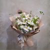 Trung tâm là 7 bông tulip trắng được chọn theo tỉ lệ bông nở và nụ vừa phải. Các nụ tròn phúc hậu đặt cạnh những cánh mở mềm, tạo nhịp điệu tự nhiên. Tôi điểm vào khoảng trống giữa các bông bằng cụm hoa trắng li ti phảng phất hương thơm nhẹ, xen đôi chùm tán mảnh như lớp sương sớm. Vài nhánh lá mảnh vươn cao và sợi cỏ rủ nghiêng tạo chiều sâu, giữ dáng bó thoáng đãng thay vì dày nặng. Phối màu chỉ xoay quanh ba gam trắng, xanh và kem hồng. Trắng của tulip làm chủ đạo, xanh của lá nâng nền, kem hồng của giấy gói ôm trọn tổng thể cho cảm giác ấm và sang.