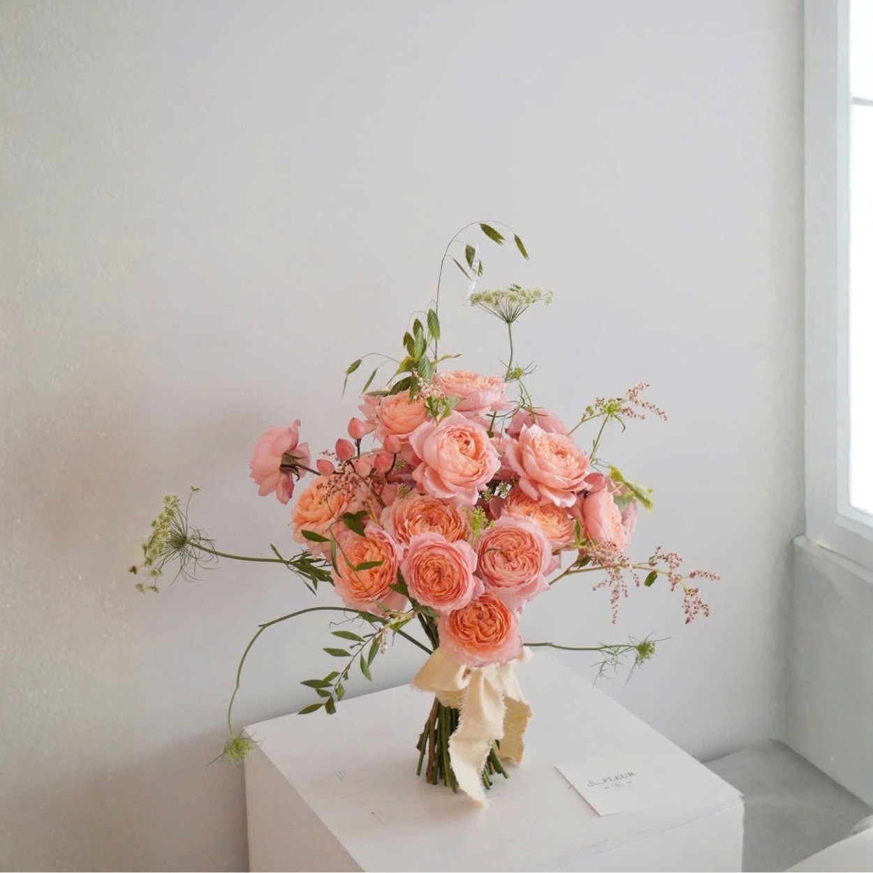 Lấy cảm hứng từ những khu vườn châu Âu đầu hạ, Those Eyes sử dụng hoa hồng làm trung tâm – những bông hồng dáng garden rose, cánh dày, xoáy tròn và nở bung đầy đặn. Gam hồng đào – hồng san hô được phối khéo để không bị chói, giữ đúng chất “soft glam” cho cô dâu hiện đại.Xen giữa những bông hồng là cụm hoa cà rốt (Queen Anne’s lace) trắng li ti, tạo cảm giác như sương mỏng vương trên tán hoa. Các cành lá phụ được để dáng tự nhiên, vươn cong mềm mại, khiến bó hoa trông như vừa được hái lên từ một khu vườn ngoài trời chứ không phải sắp xếp gò bó.Phần thân bó hoa được buộc bằng nơ vải màu kem, chất liệu gần như linen, có độ thô nhẹ tạo điểm nhấn rất “artsy”. Khi cô dâu di chuyển, dải nơ rủ xuống, đung đưa theo từng bước chân, tăng thêm cảm giác bay bổng trong từng khung hình. Tổng thể bó hoa được xử lý để cầm vừa tay, không quá nặng, giúp cô dâu thoải mái trong suốt buổi lễ.