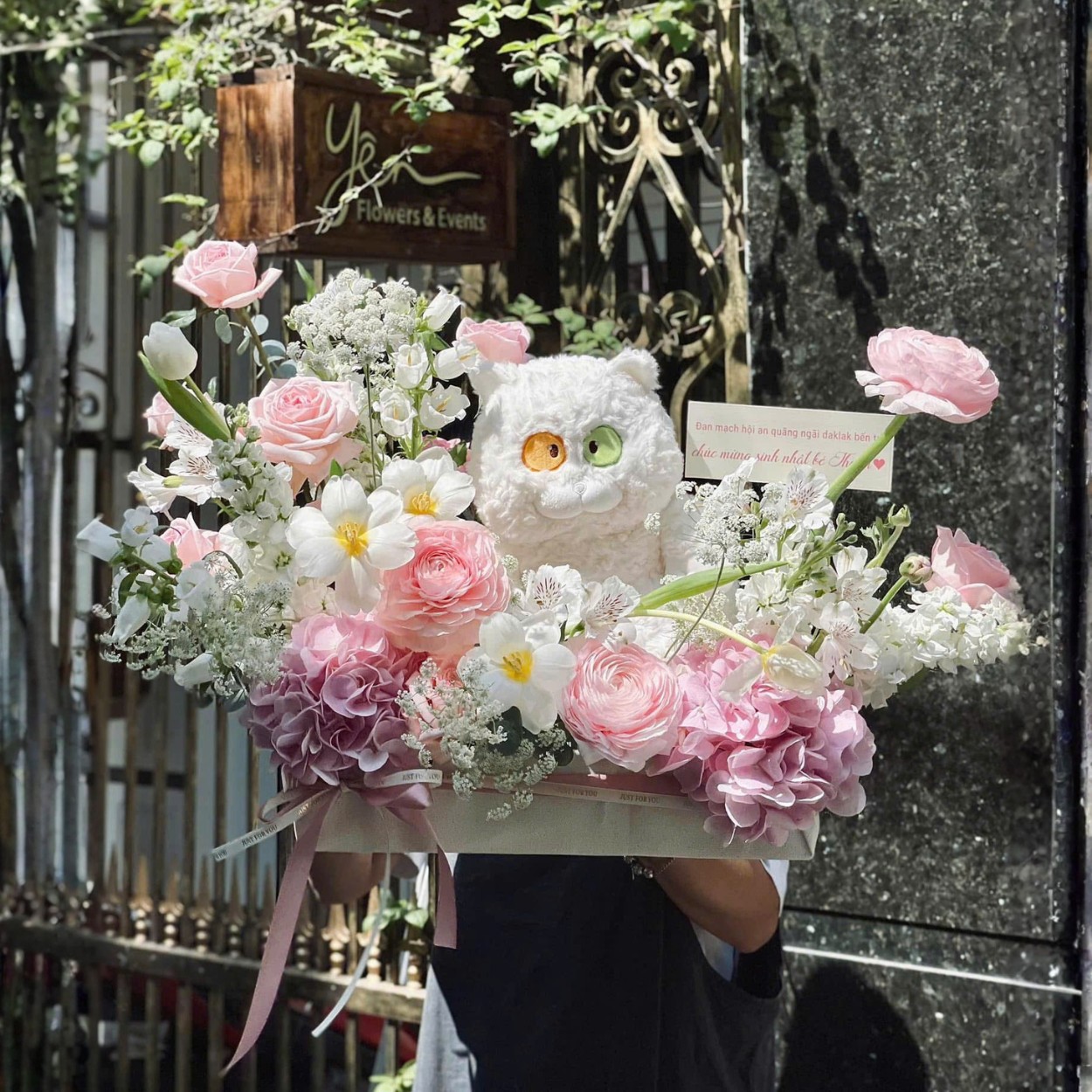 Bố cục theo vòng ôm lấy trung tâm: gấu bông ở điểm tụ, tú cầu làm nền khối tròn, tulip dựng trụ cho chiều cao, mao lương phủ các khoảng trống để tạo độ chuyển đều, hoa ren rải đều ở viền ngoài cho cảm giác mỏng nhẹ. Mình tiết chế lá để không phá vỡ mảng hồng, chỉ thêm vài nhành lá xanh non làm viền, cho tổng thể có nhịp điệu mà vẫn gọn gàng. Cảm hứng đến từ buổi chiều thu có nắng xuyên qua rèm mỏng, nên mọi chi tiết đều hướng tới sự êm ái và tinh tế.