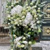 Những bông cúc pingpong tròn đầy được sắp thành cụm, giúp kệ có cấu trúc chắc, nhìn từ xa vẫn rõ khối và gần thì thấy tinh tế. Hoa baby đệm nhẹ như lớp sương, làm mềm các mảng hoa chính và tạo cảm giác “thoáng” – để kệ không bị đặc, không nặng màu. Toàn bộ được nâng đỡ bởi lá bạc (eucalyptus) cùng hệ lá phụ, vừa tạo đường bay tự nhiên, vừa mang sắc xanh xám mát lạnh, giúp tông trắng thêm nổi bật.