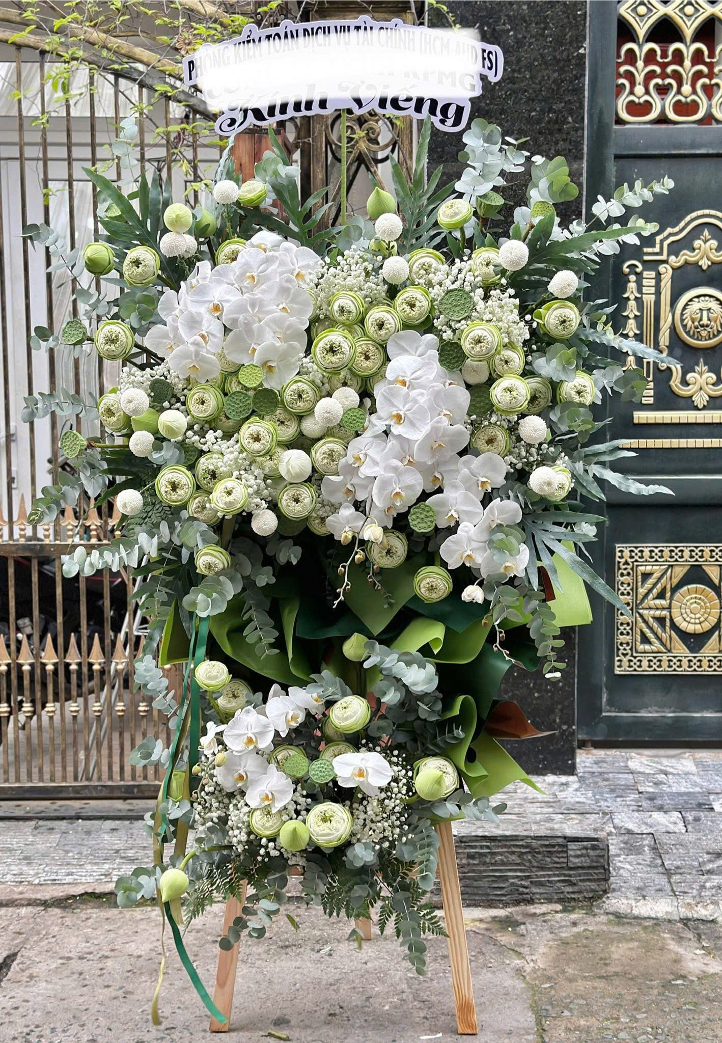 “Thương ly biệt” không chạy theo kiểu dàn trải. Kệ chia tầng rõ ràng: tầng trên là khối hoa chủ đạo (lan – sen – pingpong), tầng dưới là cụm hoa phụ lặp lại nhịp, giúp bố cục cân đối và bền dáng khi trưng bày. Các đường lá vươn nhẹ ra ngoài như một cử chỉ nâng đỡ, tạo cảm giác kệ “đứng vững” nhưng vẫn mềm mại, đúng tinh thần kệ tang hiện đại: tinh giản, có chủ ý và giàu tính thẩm mỹ.