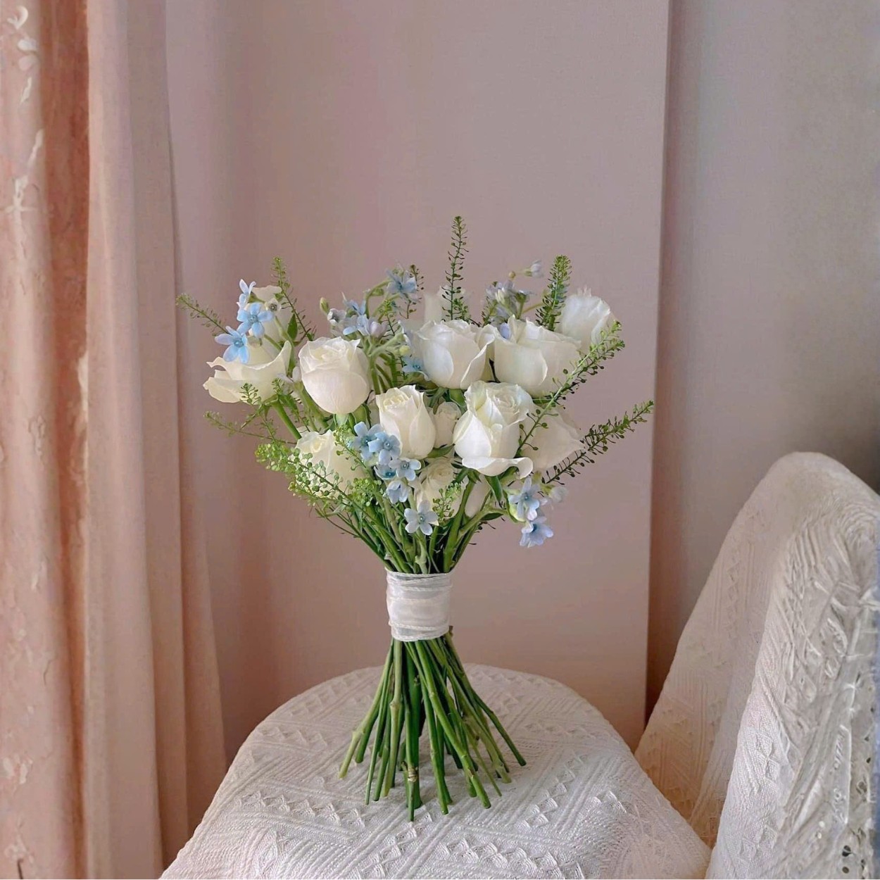 Thành phần: hoa hồng trắng – sao xanh – cỏ đồng tiền – nơ trắng mềm.Không sử dụng quá nhiều hoa, bố cục của Thủy Triều được thiết kế theo phong cách tự nhiên: những cành hồng trắng nở tròn đều được xếp vươn nhẹ lên trên, xen lẫn các cụm sao xanh li ti như những giọt sương lấp lánh. Cỏ đồng tiền được cài đan xen, tạo đường nét mềm, thở nhẹ như làn gió lướt qua mặt nước.Phần thân bó hoa được buộc bằng nơ lụa trắng mảnh, giữ nguyên độ thẳng của thân hoa – một điểm nhấn cho phong cách tinh gọn, hiện đại và rất “trong veo”.Ở góc nhìn gần, ta dễ dàng cảm nhận sự hài hòa giữa các lớp kết cấu: – sắc trắng của hoa hồng tạo nền tảng thanh lịch – sắc xanh baby từ sao xanh khiến tổng thể trở nên mát mắt – các nhánh cỏ đồng tiền kéo dài, giúp bó hoa có chiều sâu tự nhiên mà không hề nặng nềSự tinh giản này giúp Thủy Triều phù hợp với nhiều kiểu váy cưới, đặc biệt là các thiết kế tối giản, trễ vai hoặc ren mềm.