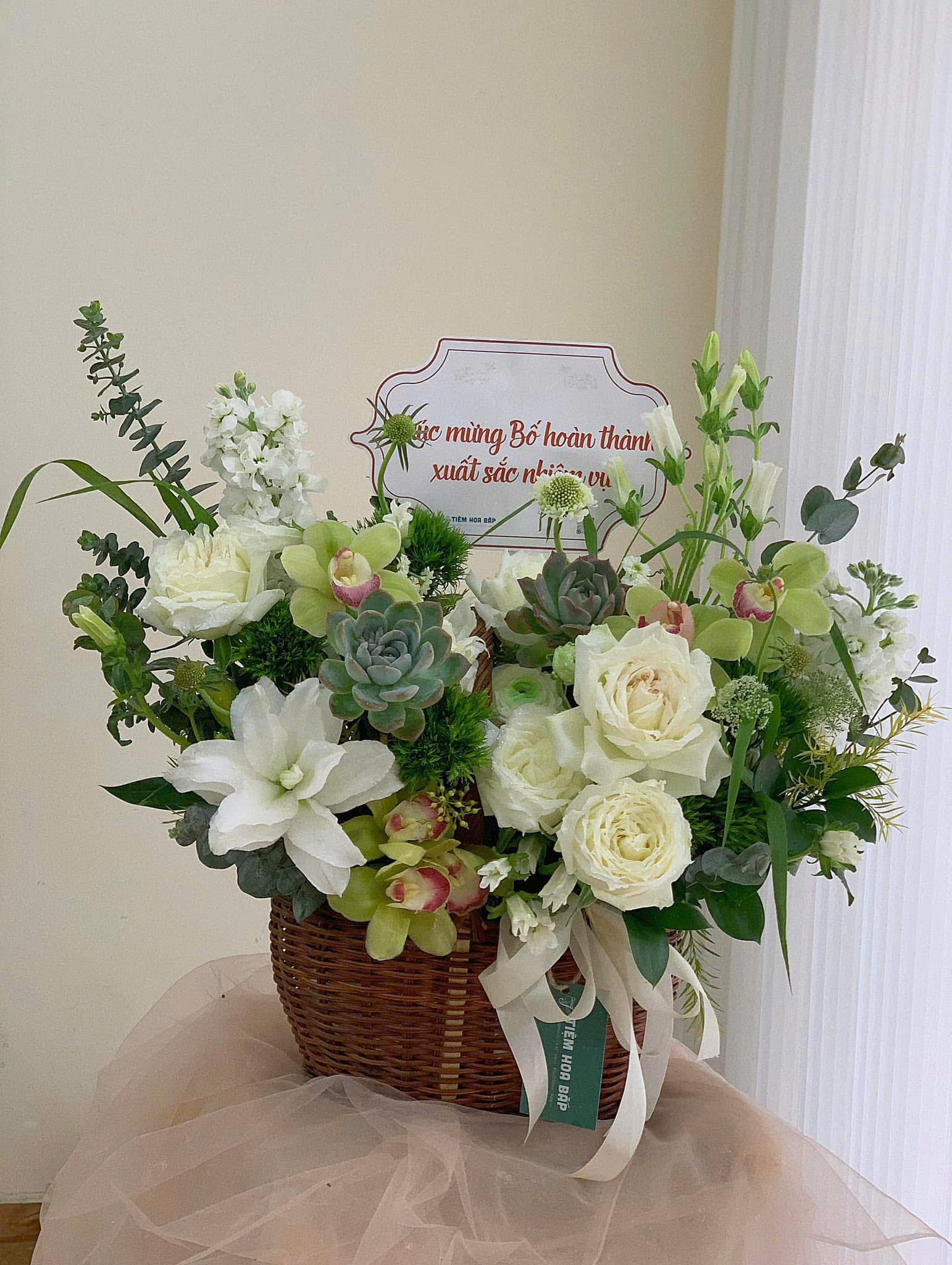 Những bông hoa tươi thắm được sắp xếp một cách khéo léo trong giỏ mây, tạo nên một tổng thể nhẹ nhàng nhưng đầy cuốn hút. Màu sắc chủ đạo của hoa hồng trắng mang đến sự trong sáng và thanh thoát, trong khi màu sắc nhẹ nhàng của hoa ly và hoa chuông bổ sung thêm sự quý phái và tinh tế. Lá xanh bao quanh các bông hoa, tạo điểm nhấn sắc nét và mang lại sự cân đối cho cả giỏ hoa. Tất cả những chi tiết này không chỉ làm đẹp không gian mà còn thể hiện sự tôn trọng và yêu thương dành cho người nhận.