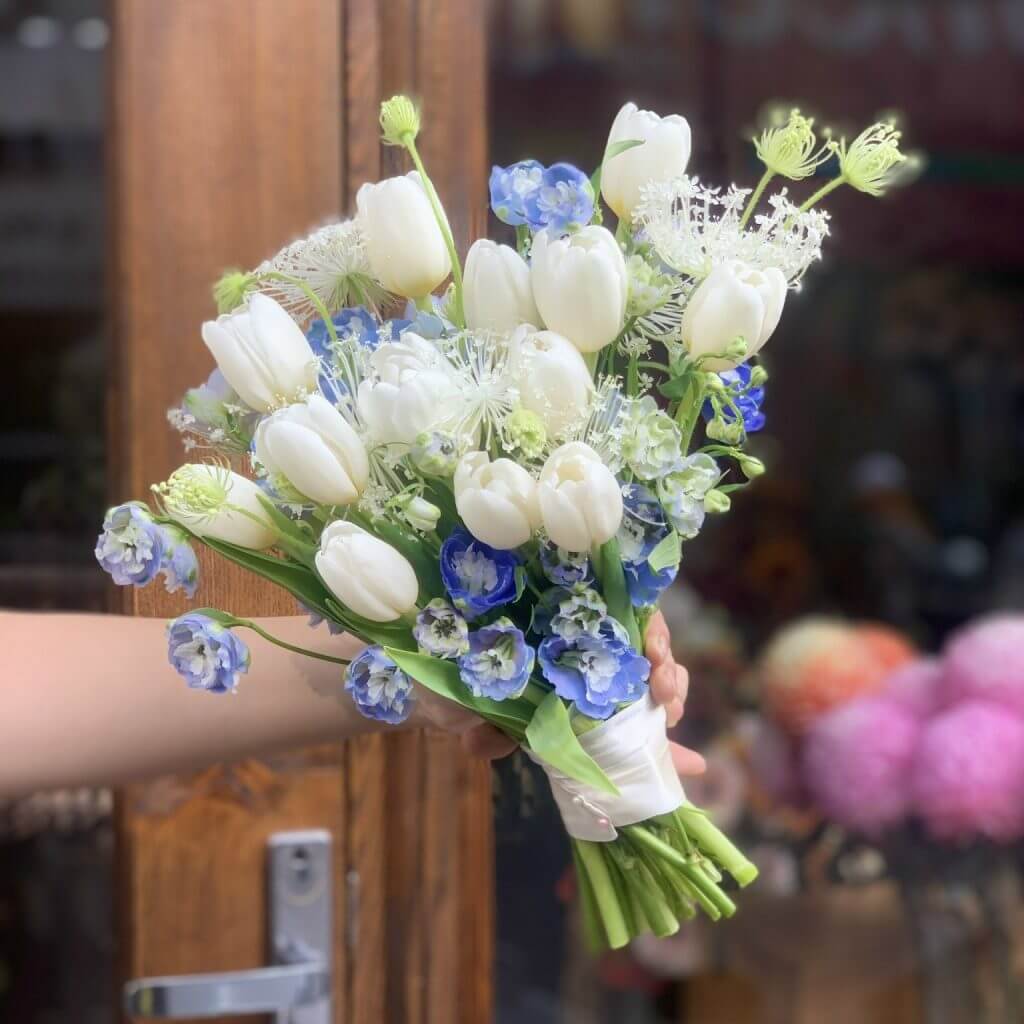 Khi bước vào lễ cưới, cô dâu nào cũng muốn trở thành tâm điểm của sự chú ý với vẻ đẹp lộng lẫy. Bó hoa cưới cầm tay tiểu thư Môi kề môi chính là một trong những lựa chọn hoàn hảo, mang đến sự dịu dàng và lãng mạn. Sự kết hợp tinh tế giữa hoa tulip, hồng tím Ecuador, hoa thanh liễu và hoa cát tường sẽ tạo nên một tổng thể hoàn hảo, nổi bật mà thanh thoát.