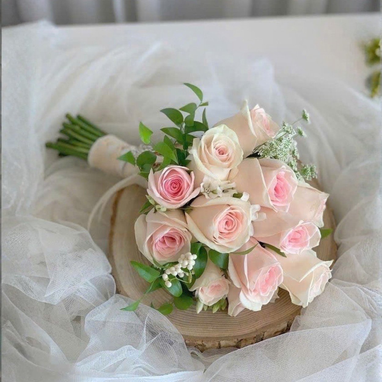 Bó hoa cưới Timeless Bloom kết hợp sự tươi mới của hoa hồng, vẻ đẹp lạ mắt của cà rốt và sự dịu dàng của lá xanh, tạo nên một tổng thể hoàn hảo và đầy ý nghĩa. Hoa hồng, biểu tượng của tình yêu vĩnh cửu, được phối hợp hài hòa cùng cà rốt mang lại vẻ đẹp nhẹ nhàng và sự ngọt ngào. Các loại lá xanh không chỉ làm nổi bật sắc hoa mà còn tạo sự mềm mại, thanh thoát cho bó hoa, giúp cô dâu tự tin trong mọi khoảnh khắc của ngày cưới.
