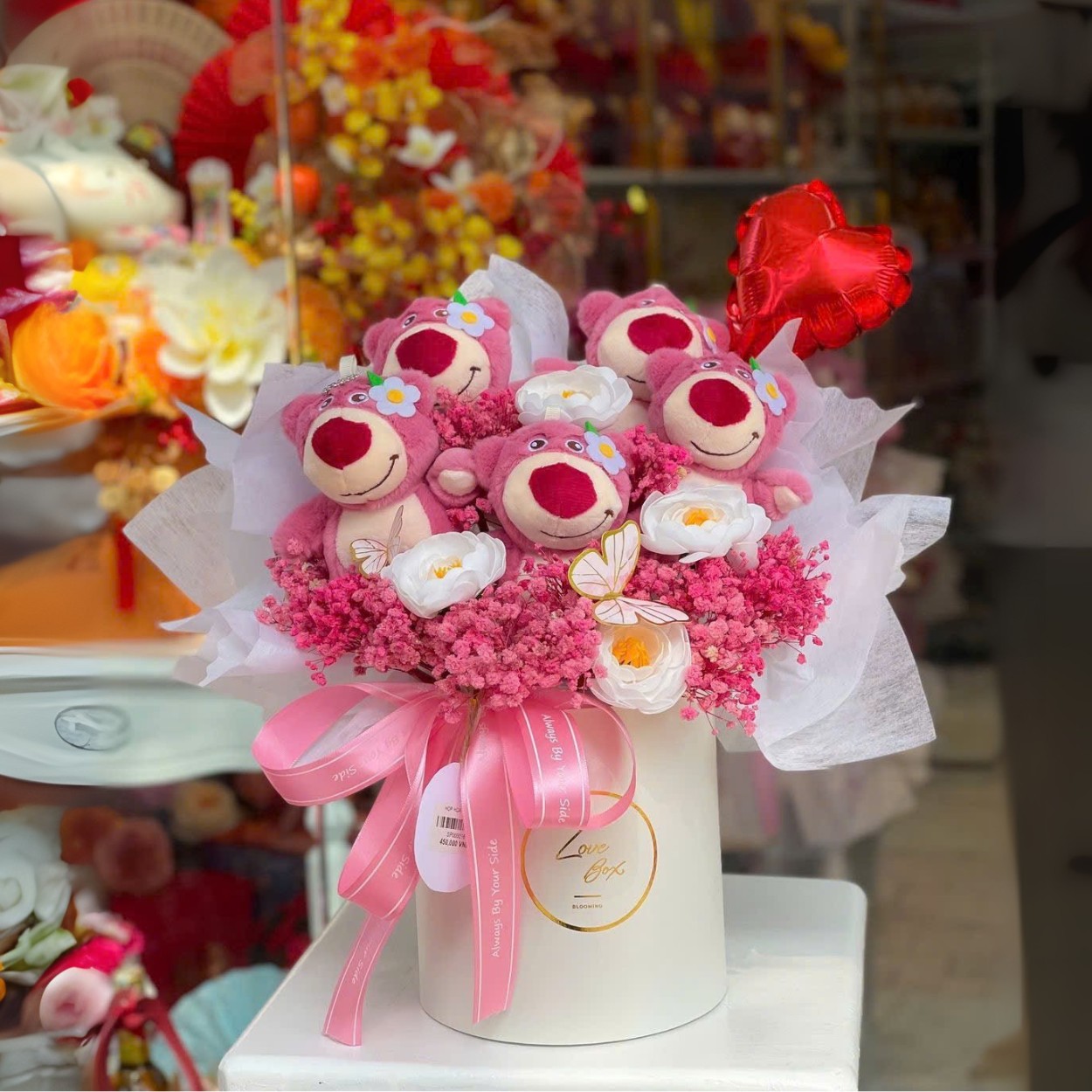 Lớp viền baby được rải vừa đủ để tạo hiệu ứng mịn như sương. Những cành nhỏ tỏa ra như hơi thở, làm dịu sắc độ của hoa sáp và kéo ánh mắt theo từng nhịp vòng. Baby không chỉ làm đẹp đường nét mà còn giúp tổng thể có khoảng thở, nhấn sâu cảm giác bồng bềnh mà một bó hoa gấu đúng nghĩa nên có. Giữa những khoảng trắng tinh ấy, gấu bông trở thành điểm tựa cảm xúc, ấm áp và gần gũi.