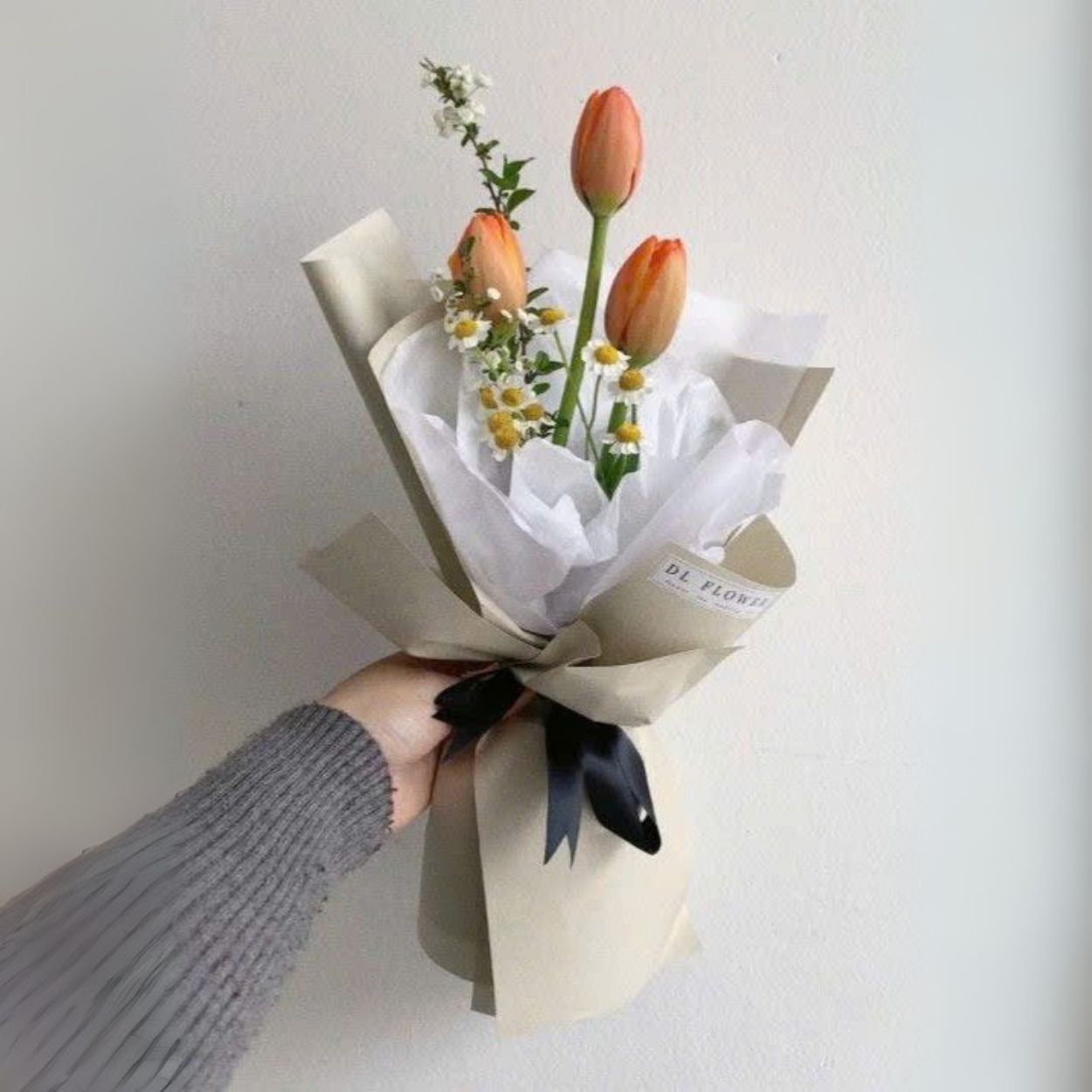 Nhìn kỹ bạn sẽ thấy ba bông tulip được đặt lệch cao thấp có chủ ý để tạo nhịp thở tự nhiên. Tulip giữ vai trò trung tâm, thân thẳng khỏe khoắn, đầu nụ căng mọng biểu đạt sự hẹn ước. Xen giữa là cúc tana li ti trắng vàng, làm sáng tổng thể và đem lại nhịp điệu vui tươi. Một nhành lá phụ thanh mảnh giúp dáng bó có điểm kết thúc mềm mại.