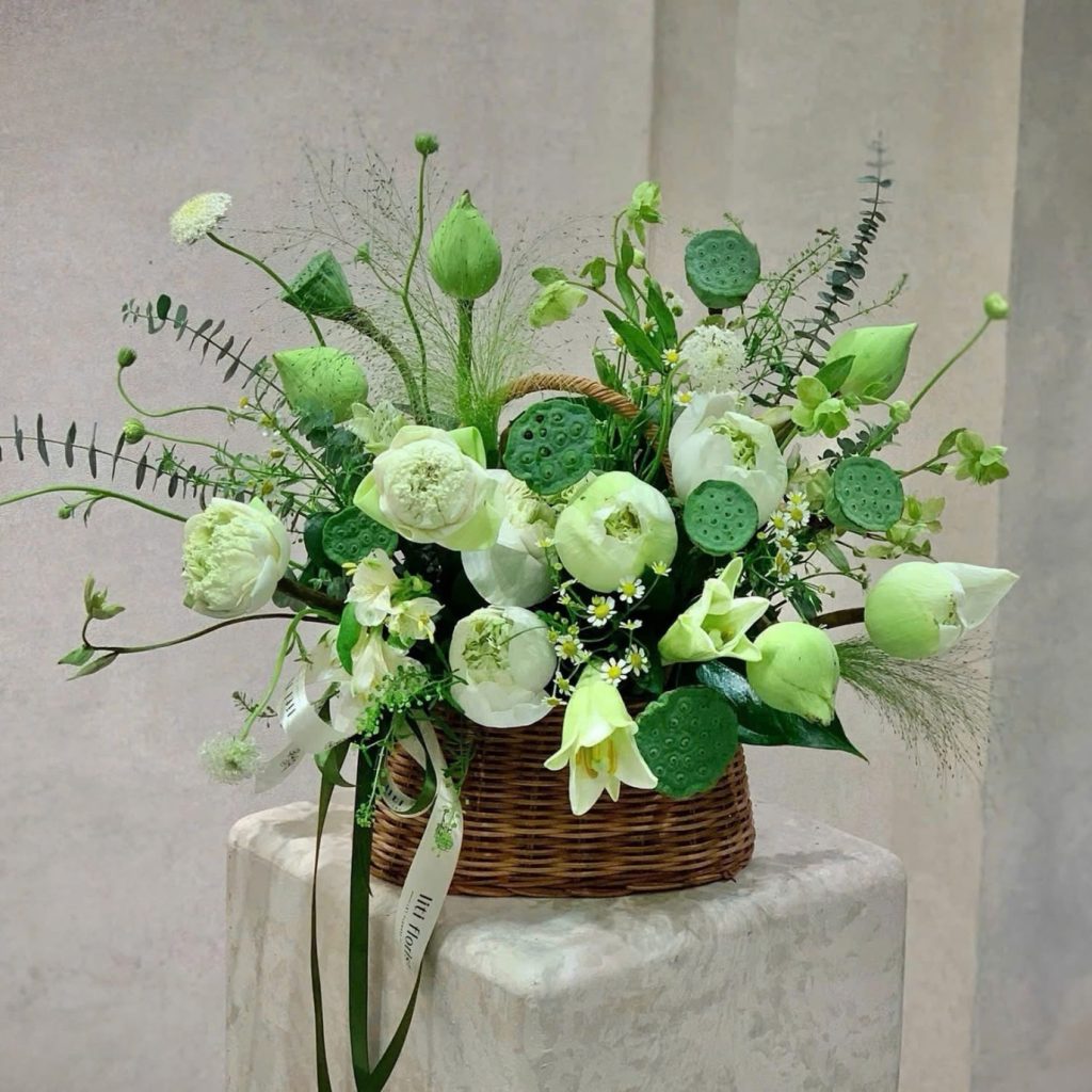 Tinh Hoa là một giỏ hoa khai trương để bàn được thiết kế đẹp mắt, kết hợp giữa hoa sen thanh cao, thúy châu duyên dáng và lá bạc sang trọng. Các loài hoa này đều mang trong mình những ý nghĩa đặc biệt, phù hợp với không khí của ngày khai trương.