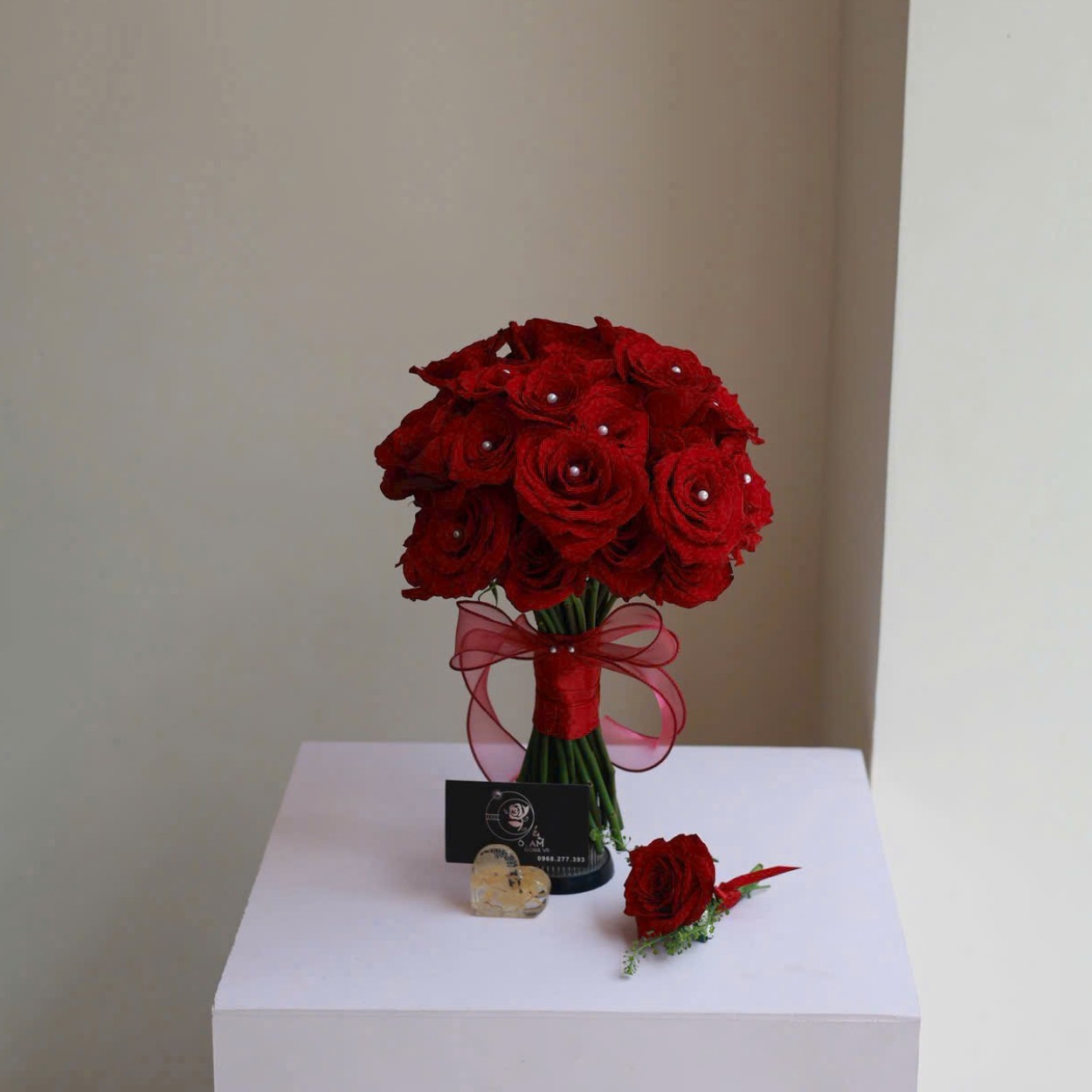 Ngay từ cái nhìn đầu tiên, Tình khúc vàng đã mang một sức hút rất riêng – không ồn ào, không phô trương, nhưng đủ mãnh liệt để khiến người ta dừng lại vài giây lâu hơn. Bó hoa được thiết kế theo phong cách cổ điển – sang trọng, lấy hoa hồng Ecuador đỏ làm chủ thể, đan xen ánh sáng tinh khôi từ hạt ngọc và được ôm trọn bởi lớp nơ đỏ trong veo tạo thành một tổng thể đằm thắm, sắc sảo và đầy tính nghệ thuật.Không chỉ là bó hoa cầm tay, Tình khúc vàng giống như lời ca bất tận dành cho cô dâu: kiêu hãnh, quyến rũ, nhưng vẫn giữ được vẻ dịu dàng rất đàn bà – một sự cân bằng đẹp đẽ mà ngày cưới nào cũng cần.
