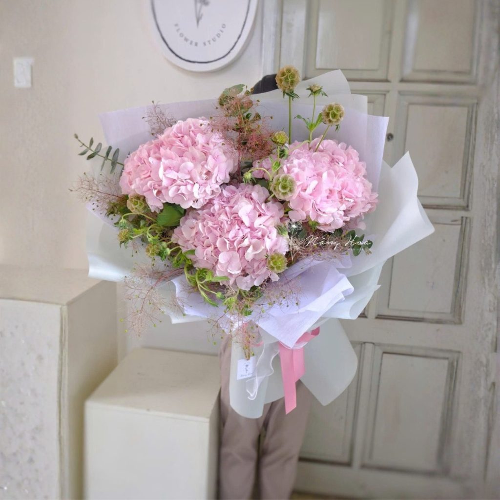 Bố cục của bó hoa được xây dựng theo tinh thần mềm mại và tự nhiên. Những khối cẩm tú cầu lớn được sắp xếp đan xen, tạo độ đầy vừa đủ, không nặng nề. Mỗi bông hoa như một mảng cảm xúc riêng, khi đứng cạnh nhau lại hòa thành một tổng thể cân bằng, hài hòa.