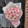 Điểm cuốn hút nhất của bó hoa nằm ở bảng màu hồng pastel được xử lý rất tinh tế. Những đóa hoa hồng mang sắc hồng kem nhẹ, cánh xoáy tròn đều, tạo cảm giác thanh nhã và dễ chịu. Xen giữa là cẩm chướng hồng với bề mặt cánh hoa xếp lớp mềm, giúp tổng thể trở nên đầy đặn hơn mà không bị nặng mắt. Hai loài hoa đứng cạnh nhau tạo nên sự cân bằng thú vị: hoa hồng dịu dàng, sang mà vẫn gần gũi; cẩm chướng trẻ trung, ấm áp và có chút đáng yêu. Chính sự hòa hợp này khiến bó hoa không quá kiêu sa, cũng không quá đơn giản, mà vừa vặn để chạm đến cảm xúc của người nhận.