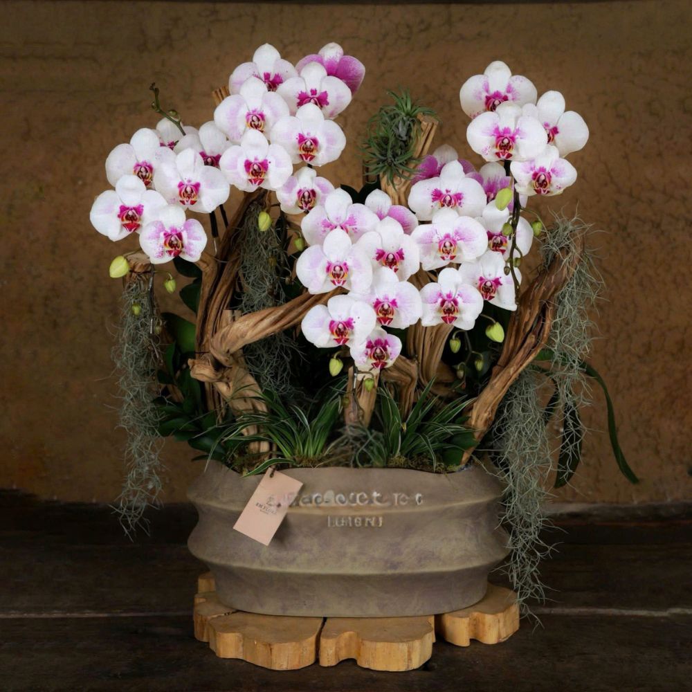 Lấy cảm hứng từ những khoảnh khắc tỏa sáng trong cuộc sống, chậu hoa được thiết kế với chủ đạo là sắc trắng pha hồng – biểu trưng cho sự tinh khôi xen lẫn chút lãng mạn. Hoa lan hồ điệp trắng pha hồng mang vẻ đẹp cân bằng giữa mạnh mẽ và dịu dàng, gợi lên cảm xúc tích cực cho người đối diện.