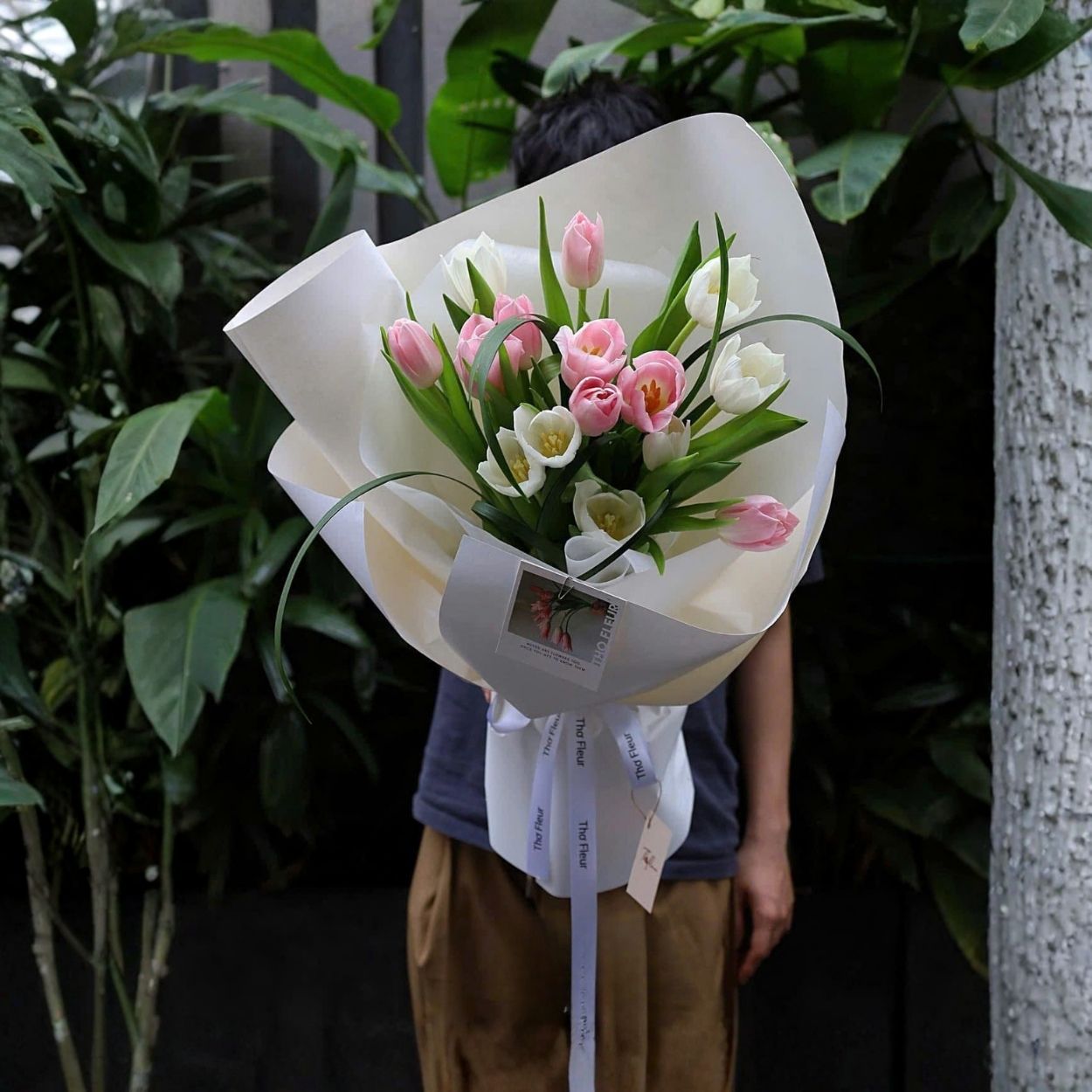 Giấy gói trắng ngà bản lớn được xếp gấp thoáng, tạo phom tai bèo mềm để tôn chiều cao của tulip. Ruy băng trắng bản rộng giúp cố định form, đồng thời mang lại cảm giác sang trọng của một món quà chuẩn chỉnh. Thẻ kèm lời nhắn đặt ở vị trí tinh tế, đủ để người nhận cảm thấy được trân trọng ngay khi chạm tay vào bó.