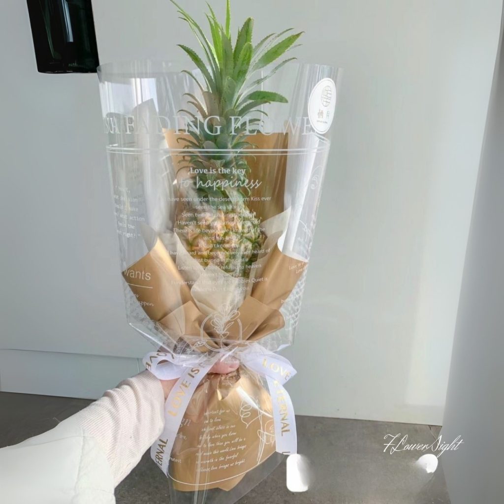 Trái thơm là món quà tinh tế với trái thơm tươi, bọc giấy gói nâu và trắng, trang trí nơ trắng, đặt trong túi bóng kính trong. Sản phẩm thích hợp mừng tốt nghiệp, sinh nhật, tặng bạn bè dịp đặc biệt, vợ dịp 8/3, mẹ dịp 20/10, hay đồng nghiệp để khích lệ, mang đến niềm vui, sự ngọt ngào và cảm xúc ấm áp.