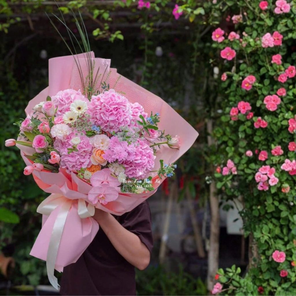 Tông hồng pastel là gam màu chủ đạo của Tri Kỷ, được dẫn dắt bởi những đóa hoa cẩm tú cầu tròn đầy, xếp lớp khéo léo tạo cảm giác vững vàng và bao dung. Xen giữa là hoa tulip với dáng thon mềm, mang lại nhịp điệu nhẹ cho tổng thể, giúp bó hoa không bị “đứng” hay nặng thị giác.