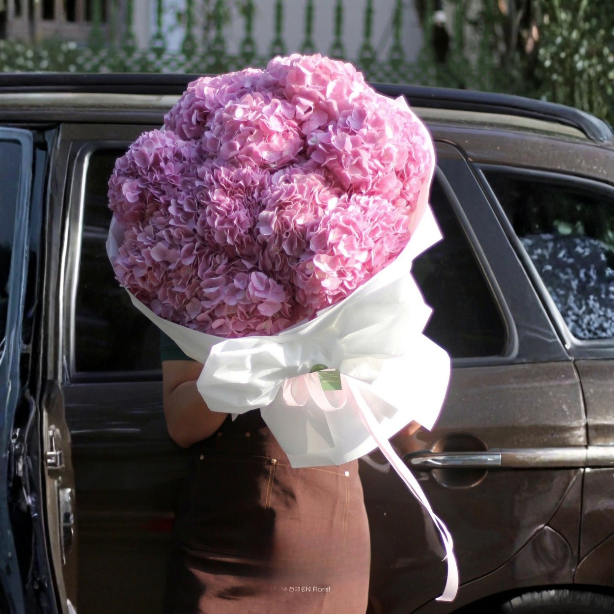 Chiếc nơ hồng nhạt được thắt gọn ở chân bó hoa, không cầu kỳ, không bản to. Chính sự tiết chế này giúp bó hoa giữ được tinh thần tinh giản, sang trọng và hiện đại – đúng với phong cách của một bó cẩm tú cầu thuần túy.