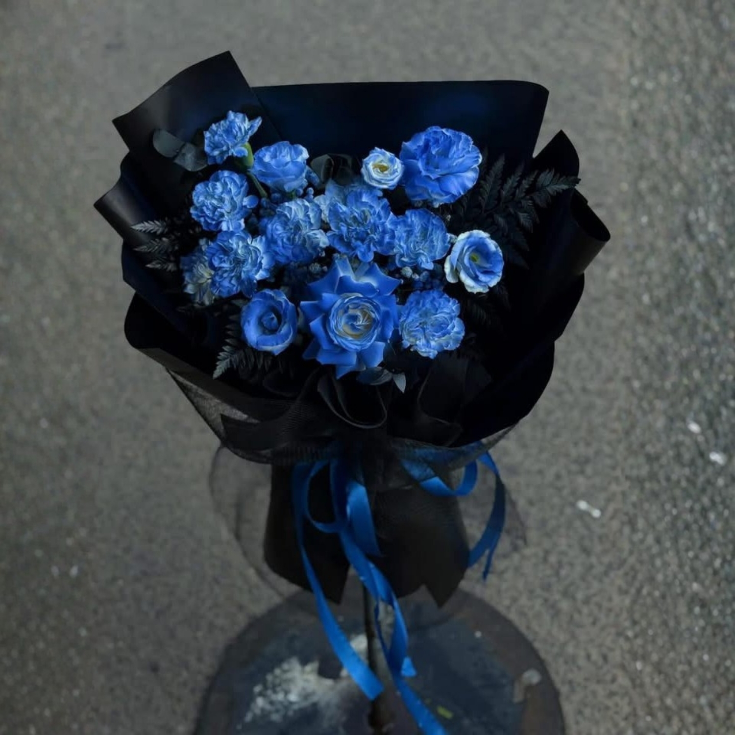 Không phải sắc đỏ rực rỡ hay pastel quen thuộc, Trời Xanh gây ấn tượng ngay từ ánh nhìn đầu tiên bằng một gam màu lạ – sâu, tĩnh và đầy chiều sâu cảm xúc. Đây không đơn thuần là một bó hoa, mà là cách kể lại hành trình trưởng thành: từ những ngày còn mơ hồ đến khoảnh khắc tự tin bước ra thế giới.