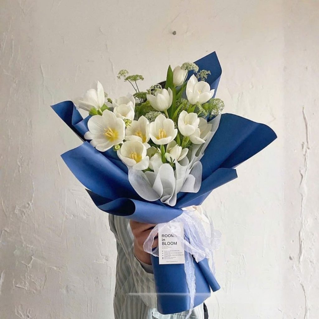 Trót yêu sử dụng tulip trắng làm chủ đạo. Cụm lá tulip xanh non được giữ lại có chọn lọc để tạo nhịp dọc cho dáng bó. Những nhánh lá phụ nhỏ xinh và vài bông hoa điểm li ti tạo hiệu ứng hít thở giúp bố cục thoáng và có nhịp điệu. Lớp giấy lót trắng mờ nằm sát thân hoa tạo rìa mềm mại. Bên ngoài là giấy gói xanh navy bản lớn gấp nếp rõ ràng tạo khung nền hiện đại cho cụm hoa trung tâm. Phần tay cầm được bọc gọn gàng giúp cầm chắc. Dải nơ trắng chất ren organza hoàn thiện tổng thể nhẹ nhàng và trang nhã.
