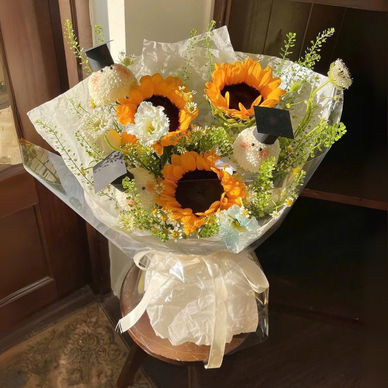 Bề mặt hoàn thiện nhấn vào sự sạch sẽ. Hướng dương được canh mặt cùng hướng, cúc ping pong chọn bông đồng cỡ để bề mặt không lồi lõm, tana rải đều tay để mép bó mịn màng. Tổng thể cho cảm giác chững chạc đúng như tên gọi nhưng vẫn giữ nét tươi trẻ nhờ ánh vàng và hạt trắng li ti.