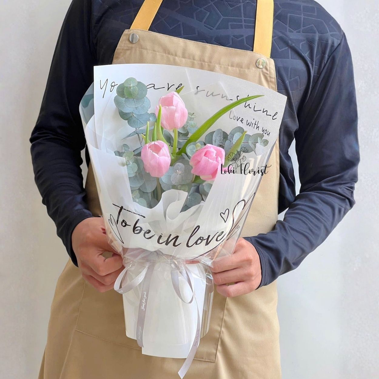 Nhìn “Tuổi mộng mơ”, bạn sẽ thấy cảm giác trong veo như buổi sớm tháng ba: vài búp tulip hồng khẽ chạm nhau, lấp ló giữa những dải lá bạc xanh mát. Lớp giấy gói trong suốt in typography mềm tay ôm trọn bố cục, để lại nhiều khoảng thở tinh tế. Dưới cùng là nơ ruy băng trắng gọn ghẽ, kết lại tổng thể thanh sạch, trang nhã và rất hiện đại. Đây là mẫu bó dành cho người yêu lối tối giản nhưng vẫn muốn một điểm nhấn thật “đắt”, đủ khiến người nhận mỉm cười ngay khi chạm mắt.