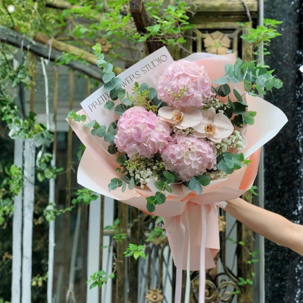 Có những bó hoa không cần “nói lớn” vẫn khiến người ta dừng lại thật lâu. United in Trance mang đúng cảm giác đó: một khoảng hồng phấn mịn như sương, chạm vào là thấy dịu, nhìn vào là thấy yên. Cẩm tú cầu được chọn tone hồng pastel, cánh dày, nở tròn như những đám mây nhỏ; vừa đủ đầy để tạo cảm giác sang, vừa đủ mềm để giữ sự lãng mạn.