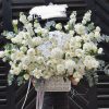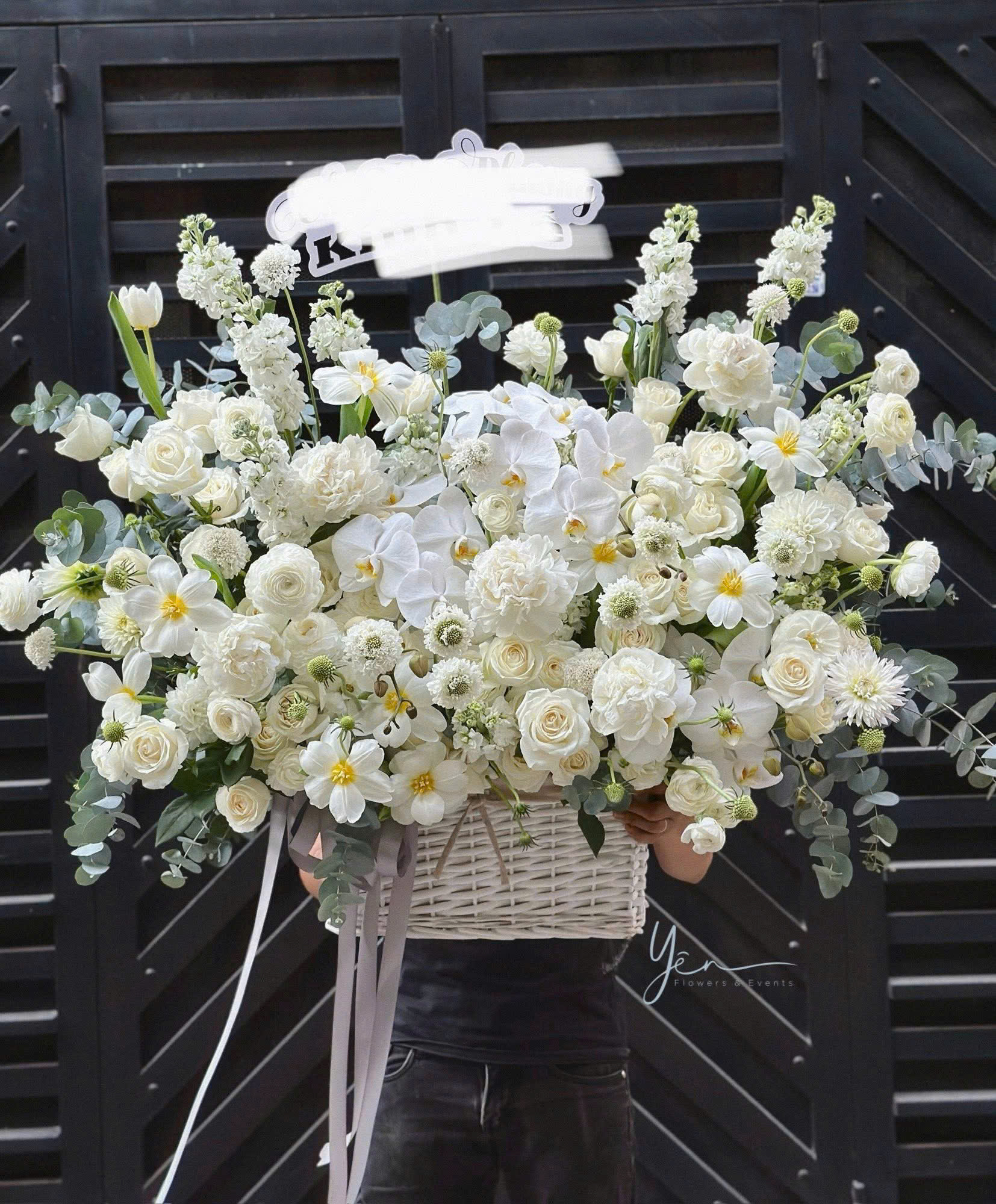 Toàn bộ được neo trên giỏ mây tông trắng, bề mặt đan tạo cảm giác thủ công ấm áp; phần lá bạc trải rộng hai bên như làn khói mỏng, làm mềm đường biên, giúp kệ hoa “thở” và có độ bay. Cuối cùng, nơ được xử lý gọn, rơi tự nhiên – đúng tinh thần hiện đại: tinh tế thay vì rườm rà.
