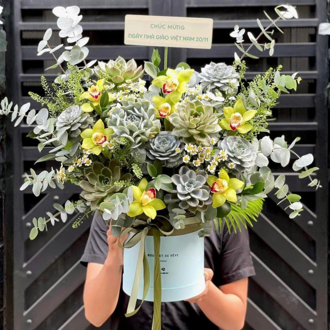 Có những giỏ hoa không cần quá rực rỡ để gây ấn tượng. “Ước Mơ Bay Xa” thuộc dòng giỏ hoa sen đá, được tạo nên dành cho những ai trân trọng vẻ đẹp chậm, sâu và có chiều dài cảm xúc. Nhìn tổng thể, giỏ hoa mang tone xanh – bạc – vàng nhạt dịu mắt, tạo cảm giác thư thái ngay từ ánh nhìn đầu tiên.