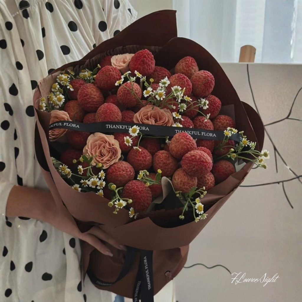 Bó hoa trái cây Vải thiều nổi bật với vải mọng, hoa hồng màu hồng và hoa cúc dại dịu mắt, được gói bằng giấy nâu sậm và điểm xuyết dây nơ đen. Tổng thể vừa sinh động vừa tinh tế, tạo cảm giác gần gũi nhưng vẫn sang trọng. Từng chi tiết từ cách sắp xếp trái cây đến bố trí hoa đều được chăm chút tỉ mỉ, khiến sản phẩm trở nên ấn tượng và ngọt ngào.