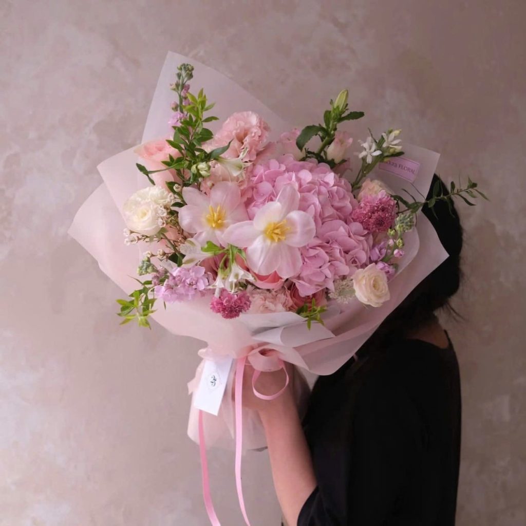 Trung tâm bó hoa là cẩm tú cầu hồng, nở dày, tròn và “bồng” như một đám mây nhỏ. Trên nền ấy, tulip mở cánh nhẹ, tạo cảm giác tinh khôi và sạch sẽ; cát tường thêm độ lụa, mềm mà sang. Các nhánh phi yến vươn cao giúp bó hoa có chiều đứng, kéo ánh nhìn đi lên, khiến bố cục không bị “nặng” dù cẩm tú cầu rất đầy.
