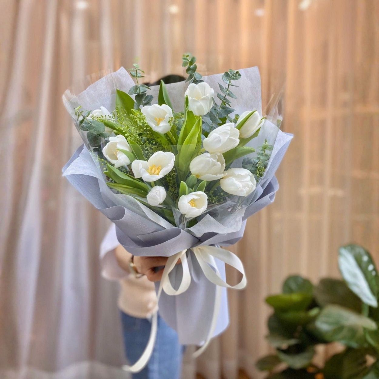 Một bó tulip trắng luôn có cách chạm vào cảm xúc rất riêng: không ồn ào, không khoa trương, chỉ một cái nhìn là hiểu nhau. “Vẫn nhớ” được tạo tác cho khoảnh khắc đó — khi bạn muốn nói điều gì thật dịu dàng mà sâu đậm. Tông trắng – xanh mát mắt, ôm trong lớp giấy gói xám khói và chiếc nơ lụa trắng, tổng thể gọn ghẽ nhưng đủ khí chất để nổi bật ở bất kỳ nơi đâu.