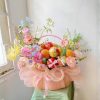 Sự xuất hiện của trái cây trong giỏ không chỉ mang tính trang trí mà còn góp phần làm “ấm” tổng thể. Nếu hoa mang đến cảm xúc, thì trái cây mang đến sự gần gũi và thực tế – hai yếu tố tưởng chừng đối lập nhưng lại hòa quyện rất mượt mà trong thiết kế này.
