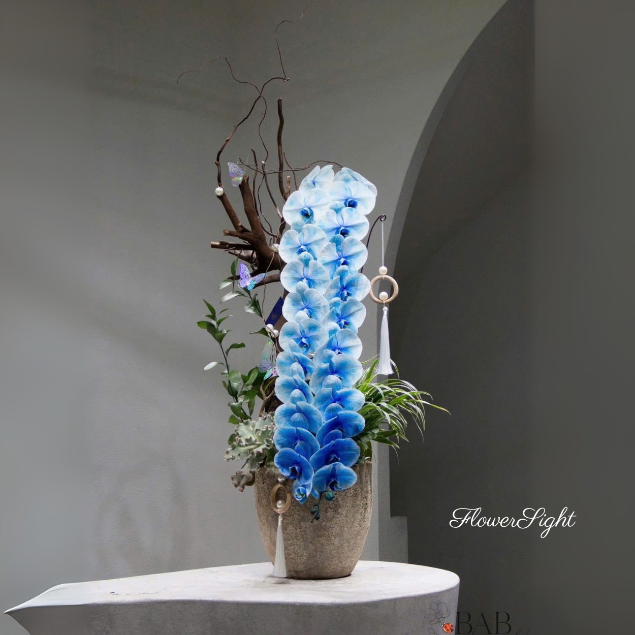 Chậu hoa Vân Tình kết hợp lan nhập khẩu, lá, thân gỗ và sen đá tạo tổng thể hài hòa, thanh lịch. Với lan hồ điệp xanh dương, món quà này phù hợp để trang trí bàn làm việc, tặng sinh nhật người thân hoặc bạn bè chúc mừng tốt nghiệp, gửi trọn vẻ đẹp tinh tế và thông điệp ấm áp.