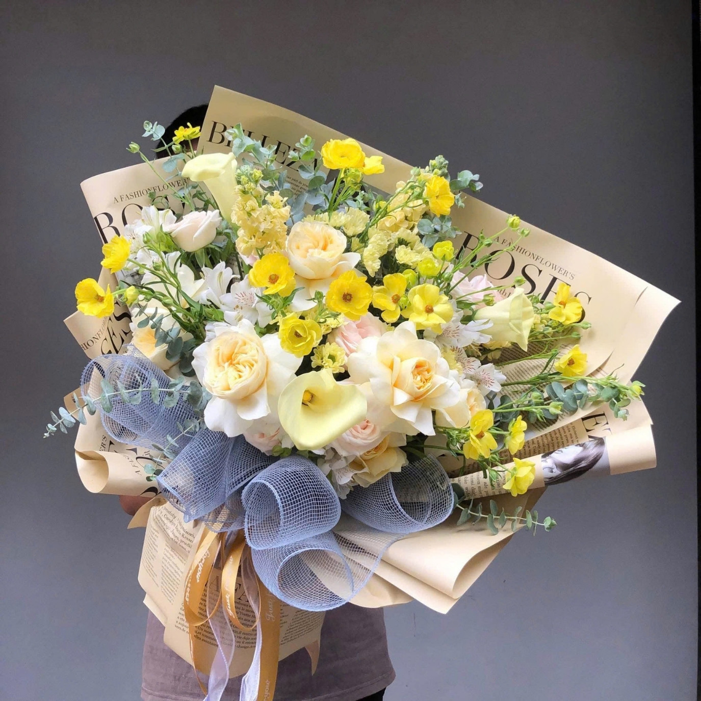 Có những lúc, ta muốn nói “Con thương mẹ” thật nhiều, nhưng lại ngập ngừng vì sợ câu chữ không đủ đẹp. “Vanity” được thiết kế như một lời nhắn dịu êm: không phô trương, không ồn ào, chỉ cần nhìn thôi đã thấy ấm lòng. Tổng thể bó hoa mang cảm giác sáng trong và mềm mại, với sắc kem – vàng làm chủ đạo, điểm xuyết xanh khói của lá bạc, tạo nên một vẻ sang nhẹ rất “đời”, rất gần.Nhìn kỹ bố cục, bạn sẽ thấy “Vanity” được xử lý theo kiểu nở tự nhiên: hoa chính ôm cụm, hoa điểm nhấn vươn thoáng ra viền, để bó hoa vừa đầy đặn vừa có độ bay. Lớp giấy gói phong cách magazine (tựa như trang báo) giúp nền hoa nổi bật hơn, còn nơ lưới xanh nhạt tạo thêm một lớp chuyển sắc tinh tế—như một cái ôm mềm đặt dưới những bông hoa đang nở.