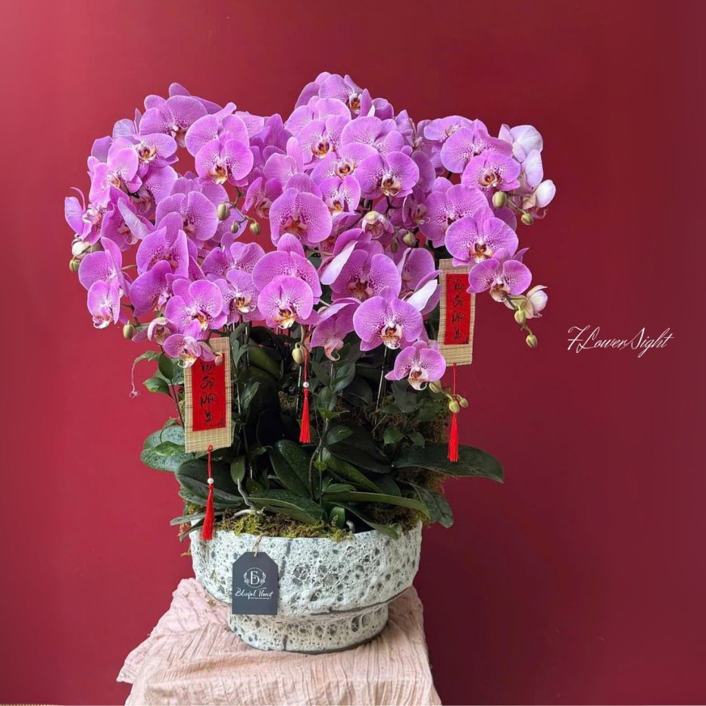 Tên gọi Viên Cát gợi nhắc đến sự trọn vẹn và may mắn, biểu trưng cho khởi đầu tốt lành trong cuộc sống. Đây không chỉ là một món quà mà còn là lời nhắn gửi về sự viên mãn và thịnh vượng. Điểm nhấn của chậu hoa nằm ở sáu cành lan hồ điệp khoe sắc, toát lên vẻ đẹp mềm mại nhưng vẫn mạnh mẽ.