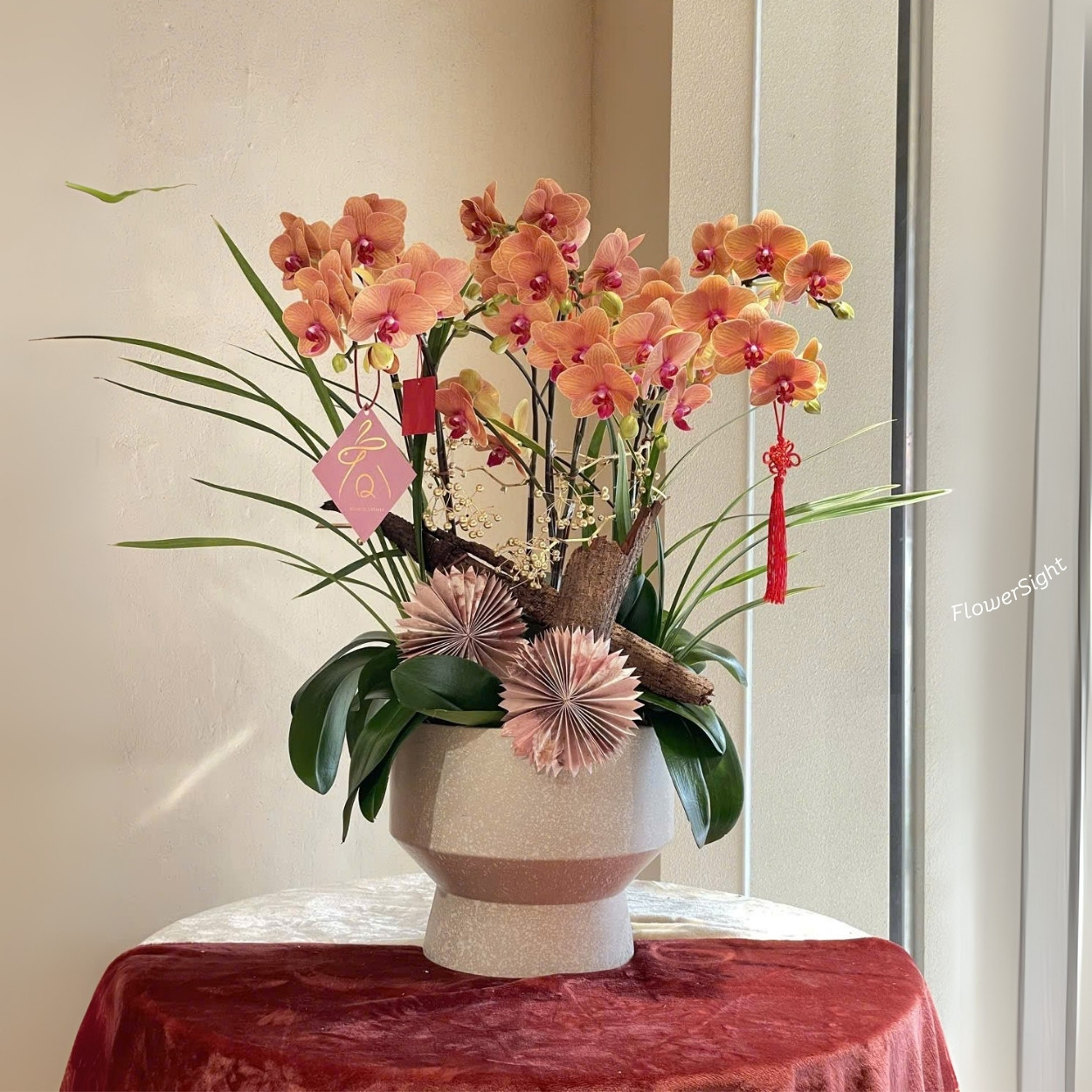 Khi tặng nhà mới, Vinh Hoa Tài Lộc là món quà tinh tế, giúp không gian trở nên rực rỡ và đón tài lộc. Sự hài hòa giữa lan, hoa giấy, lá phụ và gỗ lũa mang đến vẻ đẹp sinh động và sang trọng. Chậu hoa như lời chúc phúc cho gia chủ, đồng thời làm bừng sáng không gian.