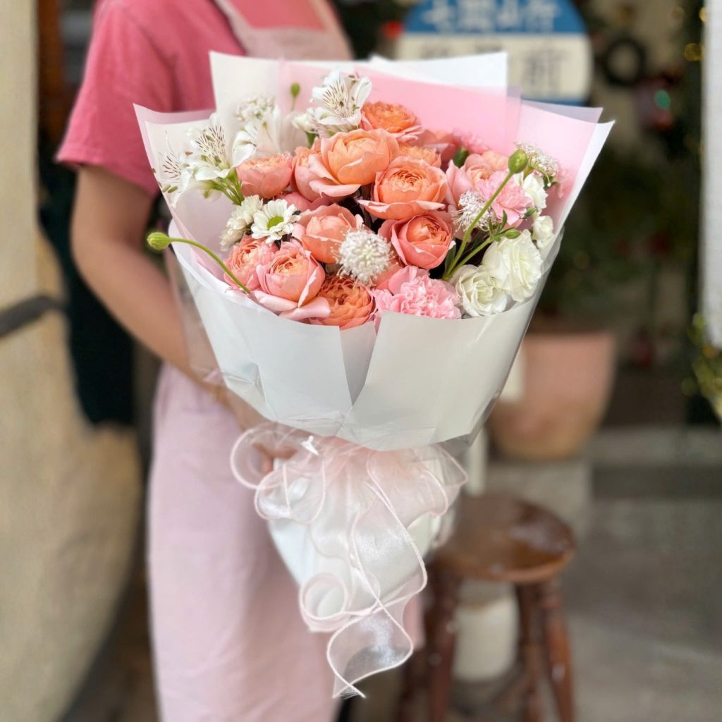 Ngay từ ánh nhìn đầu tiên, bó hoa tạo cảm giác cân bằng và thư thái. Tông màu hồng phấn chủ đạo được xử lý khéo léo, không ngọt gắt mà dịu dàng, đủ để làm sáng không gian mà vẫn giữ được nét chín chắn, sâu lắng.