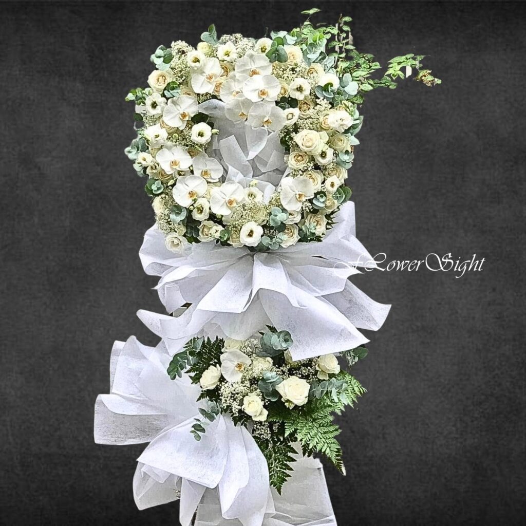 Kệ hoa chia buồn “Vô thường” là một sản phẩm tinh tế và đầy ý nghĩa, phù hợp cho những dịp chia buồn và tang lễ. Với sự kết hợp hoàn hảo của hoa lan hồ điệp, hoa hồng trắng, cát tường trắng và các loại lá phụ, kệ hoa tang này mang đến không gian trang trọng, thanh thoát và đầy cảm xúc. Mỗi loài hoa đều chứa đựng một thông điệp riêng biệt về sự tôn kính, sự chia buồn đối với người đã khuất.