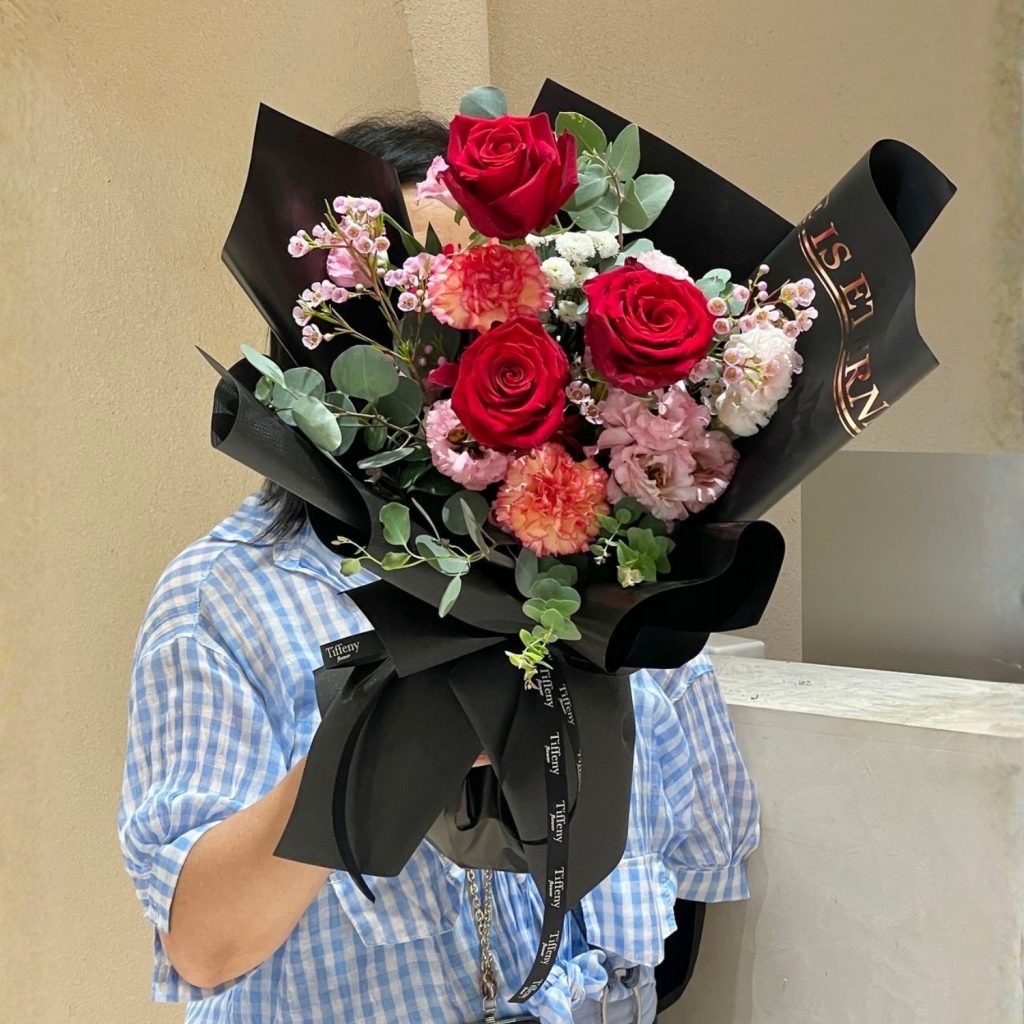 Giấy gói đen lì kết hợp cùng nơ buộc đồng màu làm nổi bật toàn bộ bố cục, tạo cảm giác sang trọng, hiện đại nhưng không phô trương. Chính sự tiết chế này giúp bó hoa giữ được vẻ thanh lịch, phù hợp với tinh thần của một cột mốc trưởng thành.