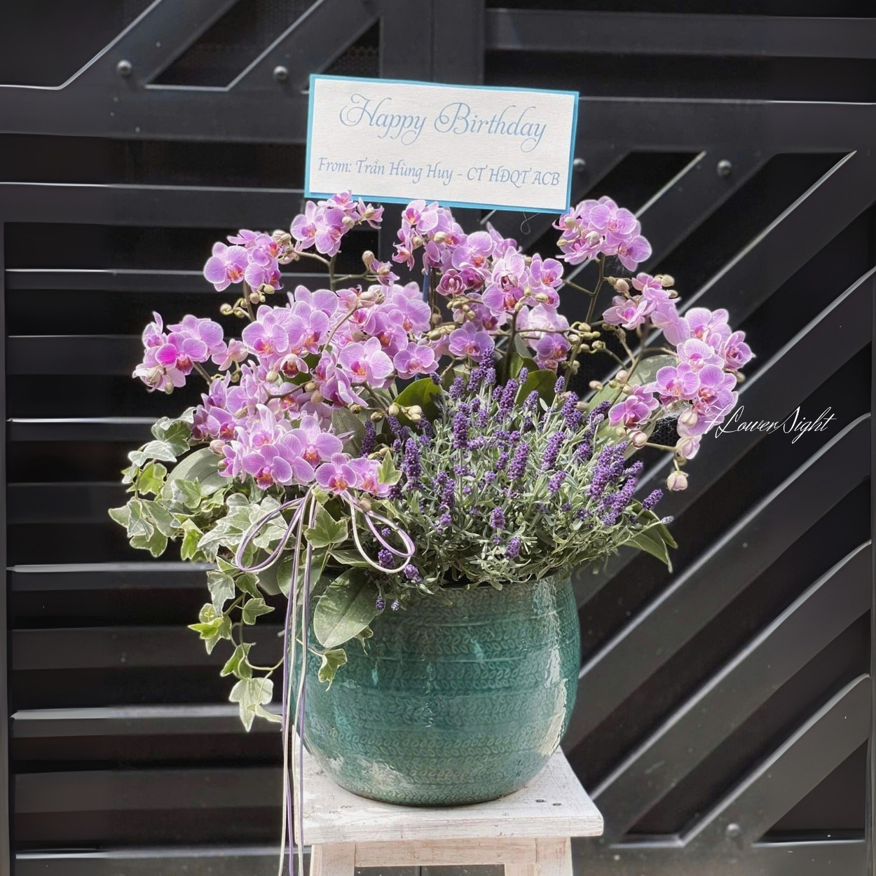 Chậu lan sinh nhật nổi bật nhờ sự kết hợp hài hòa giữa lavender và dây nho. Lavender tượng trưng cho tình yêu bền chặt và sự bình yên, trong khi dây nho mang đến sự mềm mại và tự nhiên. Tổng thể tạo nên một chậu lan sinh nhật vừa sang trọng vừa ấm áp, thích hợp để truyền tải thông điệp vững vàng và may mắn.