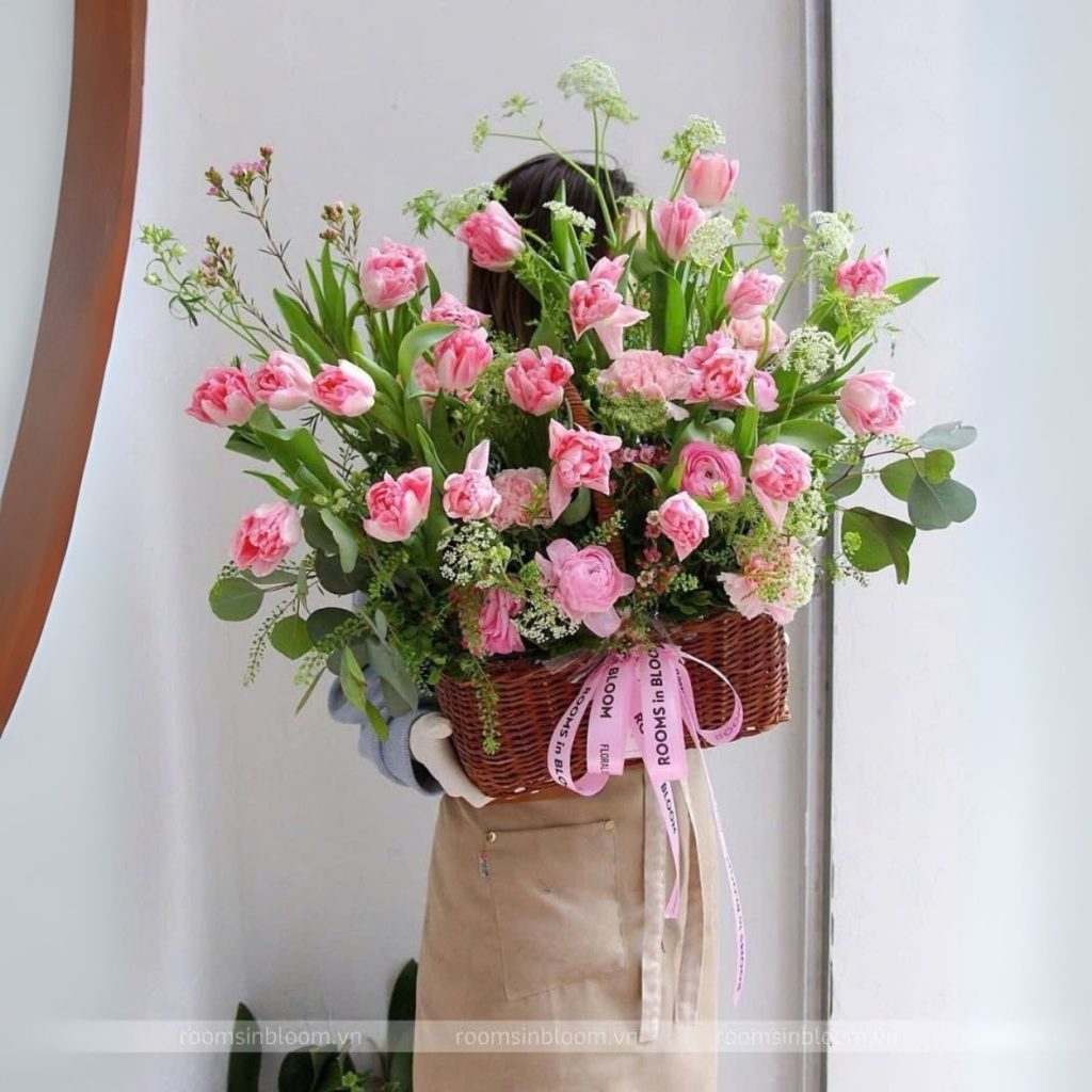 Form cắm theo dáng “vòm mở”: cao dần về trung tâm, đổ nhẹ sang hai bên, tạo nhịp điệu tự nhiên như khu vườn đang thì rộ. Các điểm tulip “leader” được đặt cao, nghiêng vừa phải để dẫn mắt; phần chân giỏ phủ lá xanh và mảng lá bạc mịn để khóa nền. Tông màu chủ đạo là hồng phấn – hồng kẹo, chuyển êm qua xanh bạc, vì vậy tổng thể vừa nữ tính, vừa hiện đại. Nơ lụa hồng pastel buộc dài giúp kéo ánh nhìn từ thân giỏ lên cụm hoa, hoàn thiện đường chuyển động thị giác.